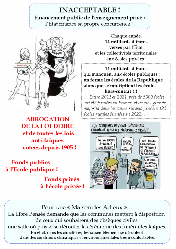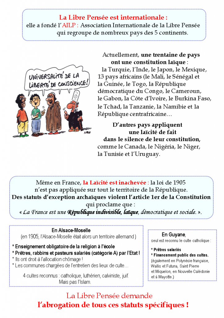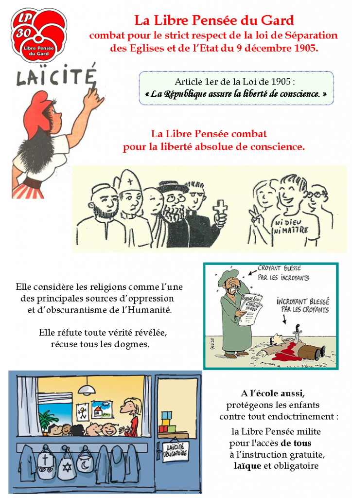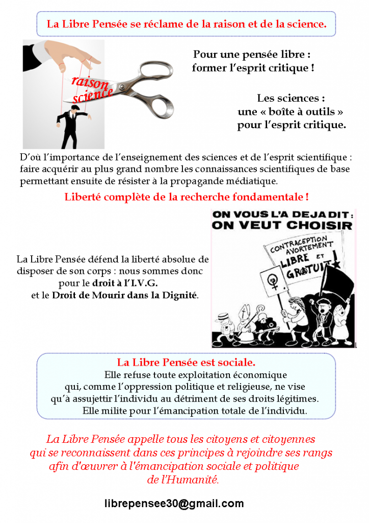 La Libre Pensée se réclame de la raison et de la science. Elle n’est pas un parti. Elle vise à développer, chez tous, l’esprit de libre examen et de tolérance. Elle défend la paix, les libertés, les Droits de l’Homme, la Laïcité de l’École et de l’État. Elle se bat pour la liberté d’opinion.