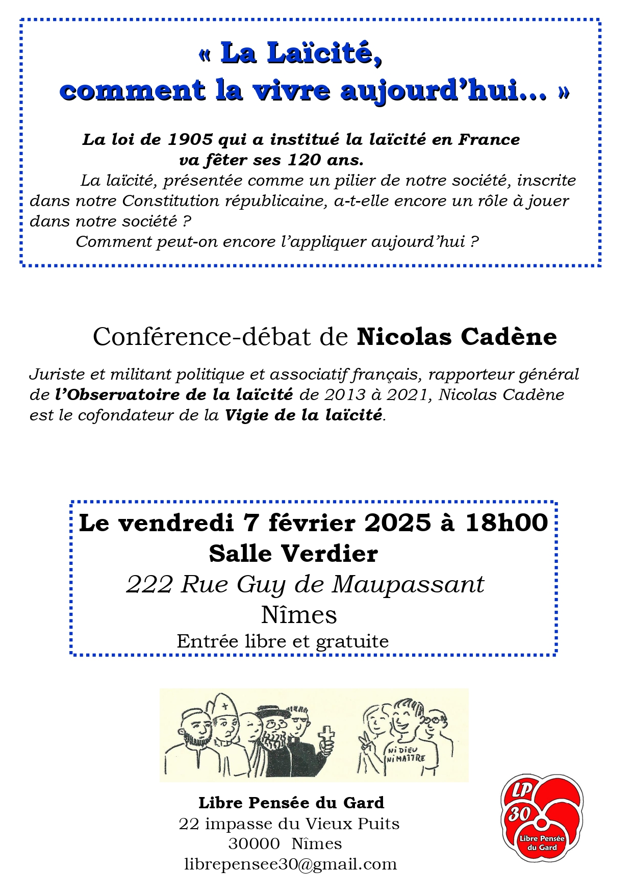 Conférence-débat à Nîmes sur la laïcité aujourd’hui – avec Nicolas Cadène 8 février 202527 janvier 2025 par Chris Lire la suite