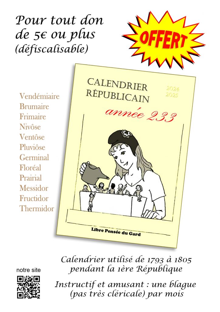 Faites-nous un don Votre nom Votre prénom Votre e-mail Je fais un don à la Fédération de la Libre Pensée du Gard de : € Par virement bancaire à l’IBAN FR76 3000 4006 4400 0089 0665 928 Ou bien par chèque libellé à : FDLP30 posté au 8 rue Urbain de Tessan, 30 000 Nîmes. N.B. : Nous vous enverrons un Reçu Fiscal qui vous permettra une éventuelle défiscalisation.Tout don à la Libre Pensée du Gard ouvre droit à une réduction d'impôts de 66% de son montant. Pour un don d'au moins 5€ à notre Libre Pensée du Gard, vous recevrez, en plus de votre Reçu Fiscal, un calendrier républicain en cadeau (voir sous le bouton « Envoyer » ci-dessous). Par exemple, un don de 5€, une fois la déduction fiscale opérée, vous revient à 1,70€. Un don de 10€=3,40€ ; 50€=17€ ; 100€=34€, etc. Δ Partager sur FacebookTweet