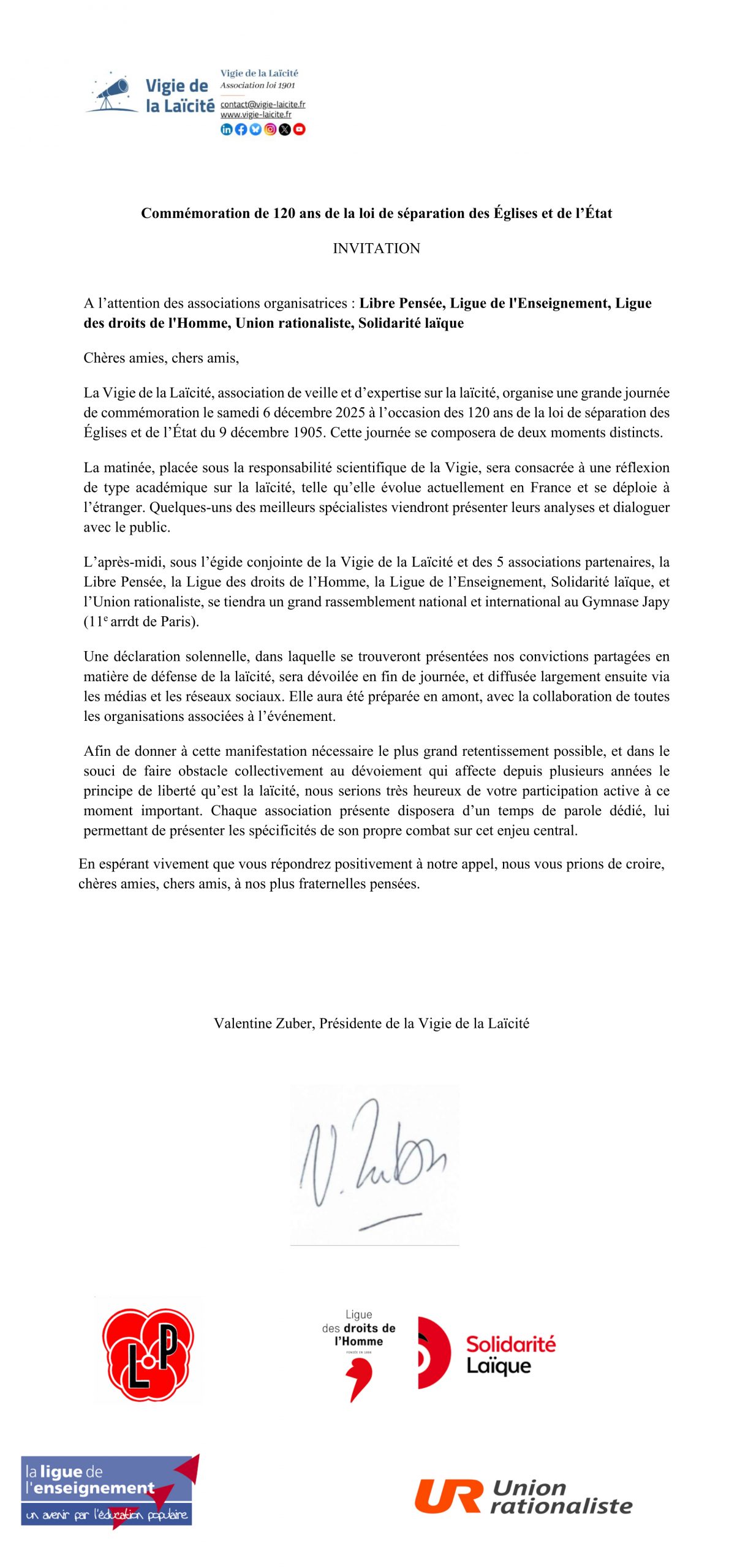 Invitation à la commémoration de la loi de séparation des Eglises et de l’état 27 novembre 2025 par Chris Partager sur FacebookTweet Partager sur FacebookTweet